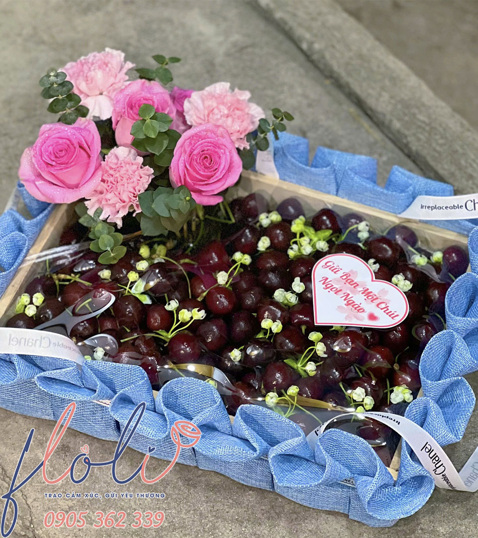 Sản phẩm gồm 2Kg trái Cherry nhập khẩu tươi ngon, FLoLi kết hợp với những bông hoa, phụ kiện trang trí và thiệp ghi nội dung ý nghĩa theo yêu cầu của khách hàng.
