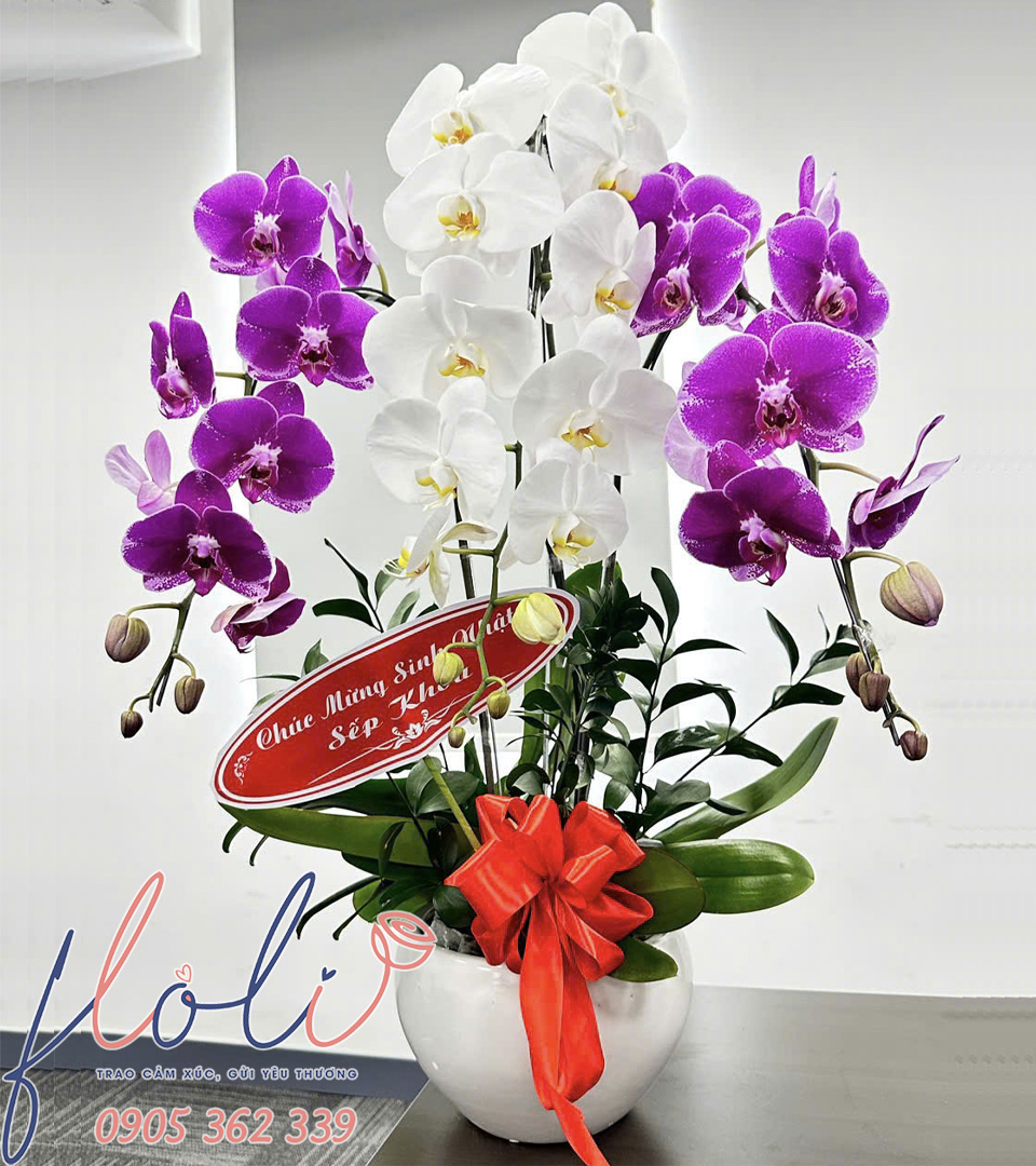 - Chậu lan hồ điệp 5 cây sang trọng: Lan Hồ Điệp Khai Lộc Khởi Sắc LHD1600 được thiết kế với 5 cây lan hồ điệp tươi thắm, mỗi cây lan đều được chăm sóc tỉ mỉ để mang đến vẻ đẹp tươi mới, bền lâu. Hoa lan hồ điệp không chỉ nổi bật với sắc màu rực rỡ, mà còn là biểu tượng của sự thanh cao, quý phái và may mắn trong cuộc sống.