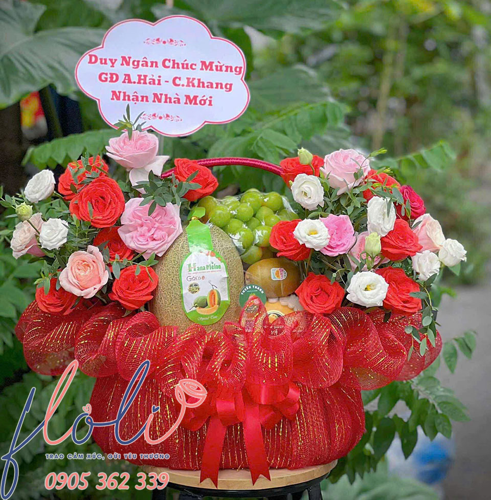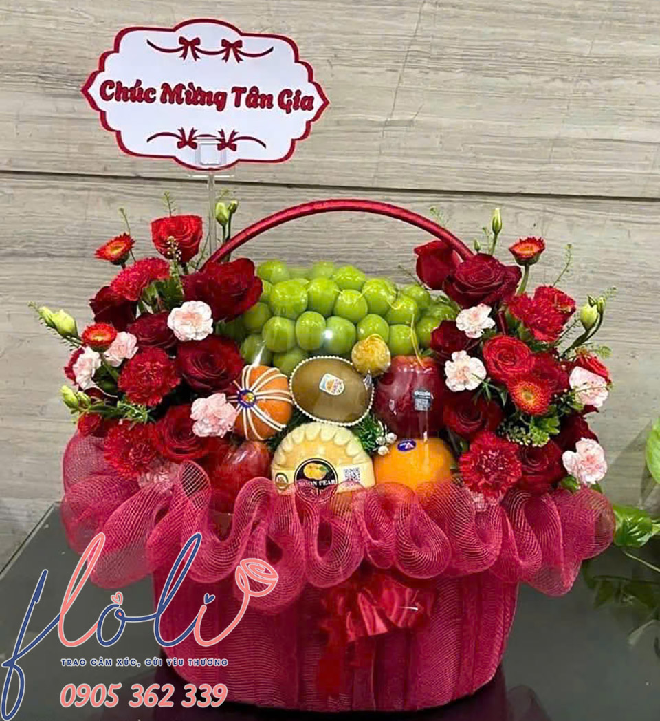 Một giỏ trái cây mừng tân gia kết hợp với hoa tươi chắc chắn sẽ khiến gia chủ ấn tượng ngay từ cái nhìn đầu tiên.- Thành phần thường có: Trái cây (nho, táo, cam, lựu, kiwi…) kết hợp hoa hồng, hoa cúc mẫu đơn, hoa lan…