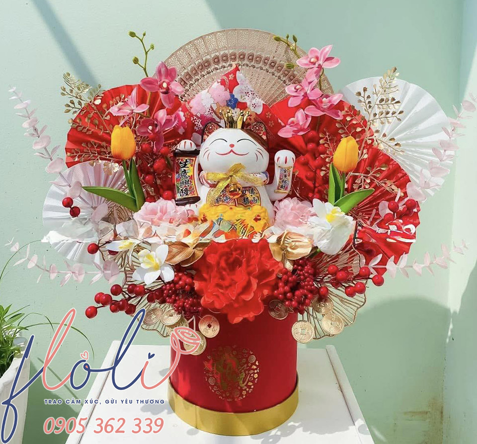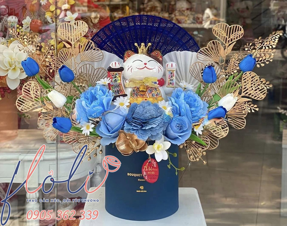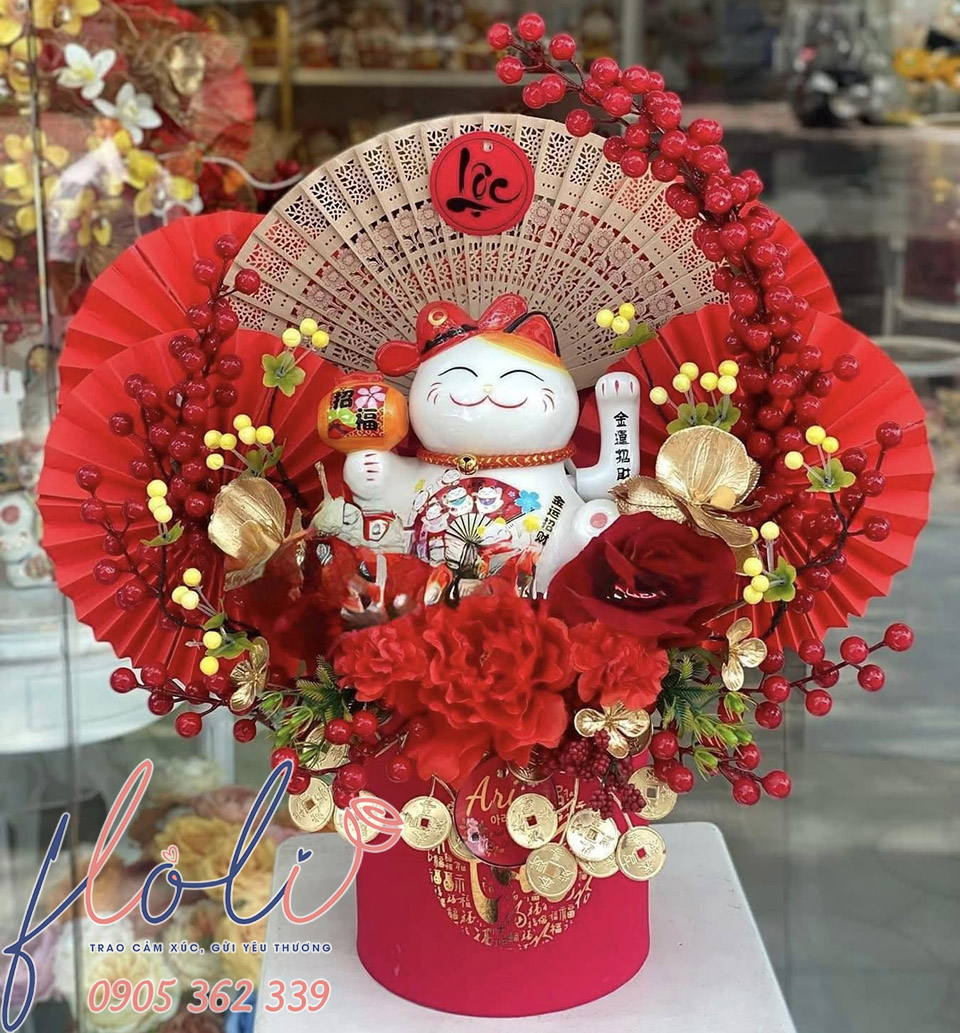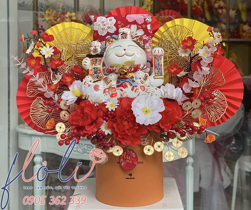 Mèo thần tài mừng khai trương của FLoLi được đóng gói trong hộp chỉn chu, kèm phụ kiện trang trí bắt mắt, vừa sang trọng vừa thể hiện lời chúc may mắn tinh tế