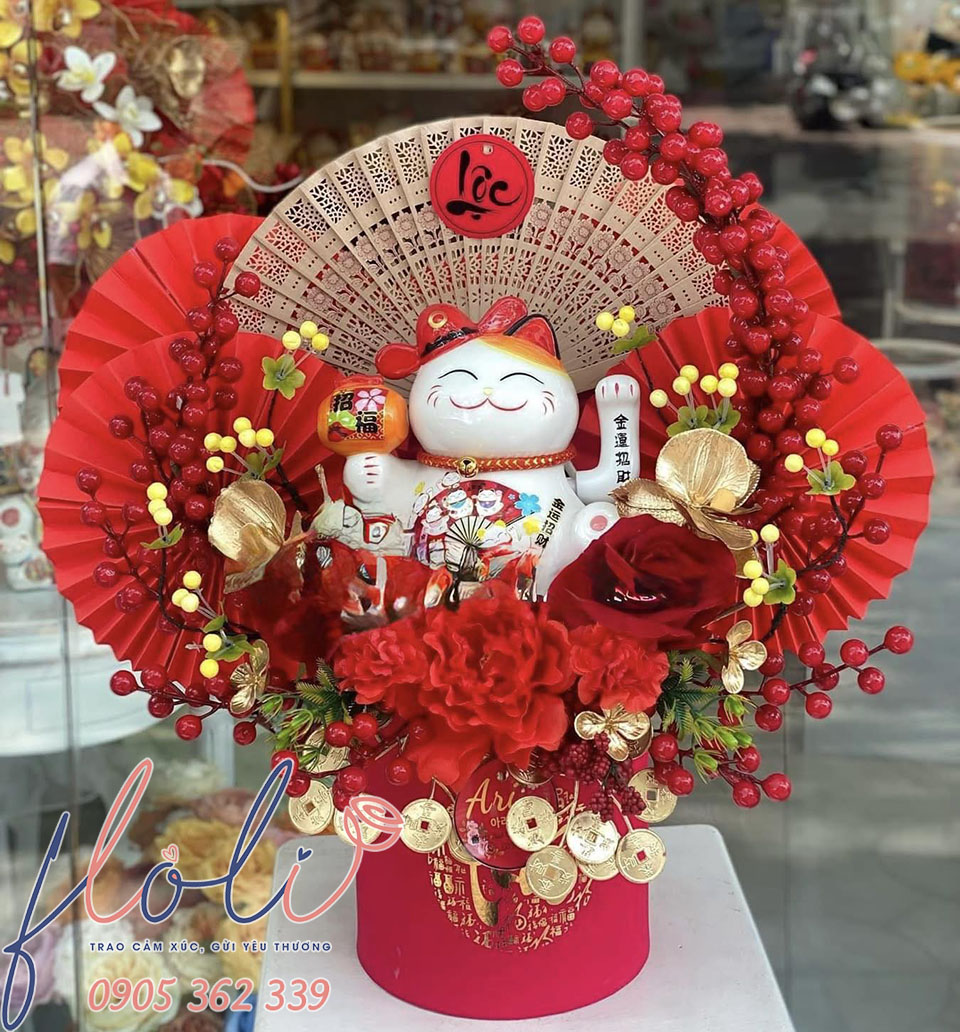 Gói quà chỉnh chu, đẹp mắt: Một hộp mèo thần tài có đệm gấm đỏ, túi giấy cứng hoặc hộp quà có nơ đỏ – vàng sẽ thể hiện sự tôn trọng. Ngoài ra, bạn có thể trang trí thêm hoa lụa, quạt giấy, cành kim tiền, quả trang trí hoặc phụ kiện màu đỏ – vàng như trong hình để món quà trông nổi bật, sang trọng và mang hơi hướng phong thủy tốt lành hơn.